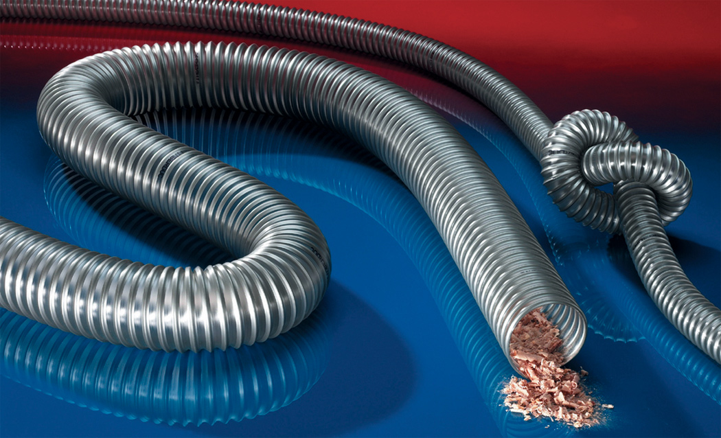 Wąż do przemysłu drzewnego, grubość ścianki 0.6 mm Zastosowanie: bardzo elastyczny wąż do odciągu wiórów drzewnych, pyłów, trocin. Bardzo dobrze sprawdza się przy odciągach stacjonarnych, maszynach do obróbki, np. piły, obróbka obrzeży. Wąż jest trudnozapalny według DIN 4102-B1, zgodny z ATEX 2014/34/EU i niemiecką normą TRGS 727. Ścianka węża trwale antystatyczna.