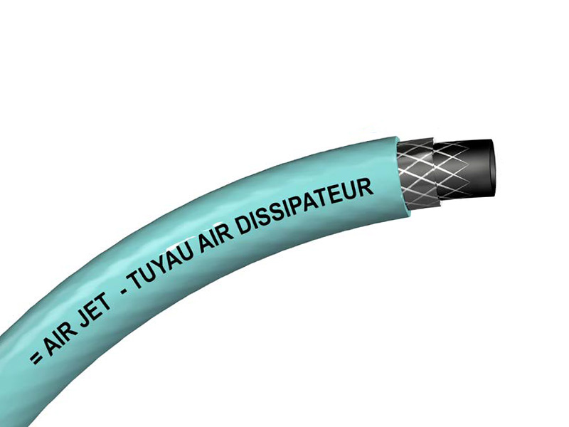 Wąż tłoczny AIR-JET wykonany jest z kilku warstw tworzyw sztucznych, warstwy zewnętrzna i wewnętrzna są wykonane z termoplastycznego poliuretanu TPU, wzmocniony siatką poliestrową. Warstwa wewnętrzna przewodząca ładunki elektrostatyczne R < 106 Ω.