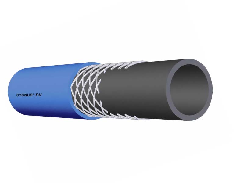 Wąż tłoczny CYGNUS PU ETHER z rdzeniem wykonanym z poliuretanu (PU) i specjalnie zaprojektowanej bardzo elastycznej gumy syntetycznej na pokryciu, wzmocniony wkładką tekstylną.