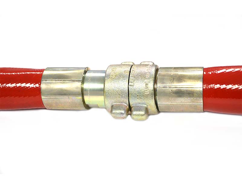 Złącza LUDECKE 65/53 FL Typu "Atlas Copco" z króćcem do węża i gwintem zewnętrznym ze stali ocynkowanej, z nakrętką z gwintem wewnętrznym z żeliwa ciągliwego, odlewanego z płaską uszczelką wykonaną z NBR. Złącza zamontowane fabrycznie na wężach, w celu zagwarantowania parametrów wytrzymałościowych, przy użyciu tulei zaciskowych.