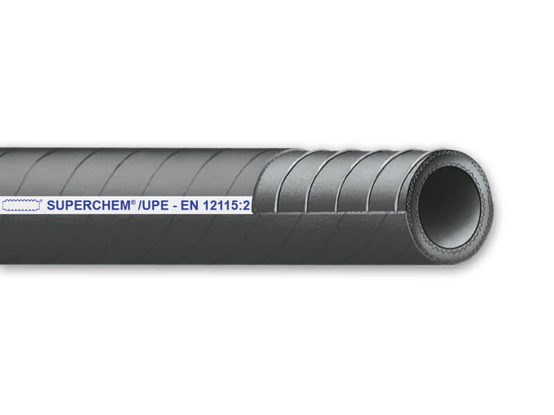 SUPERCHEM®/UPE/EN to wysokiej jakości wąż ssawno-tłoczny, przeznaczony do transportu agresywnych chemicznie substancji. Wąż jest niezwykle elastyczny i spełnia wszystkie wymagania normy EN12115:2011 dotyczące promienia gięcia, ogniotrwałości, wydłużenia, współczynnika bezpieczeństwa ciśnienia rozrywającego (1:4), oporności elektrycznej itp. Wewnętrzna warstwa węża wykonana z elastycznego i wytrzymałego UPE o grubości 0,2 mm, co zapobiega możliwości kontaktu transportowanych substancji z zewnętrzną warstwą z gumy EPDM. Może pracować w strefach zagrożonych wybuchem (ATEX), dzięki przewodzącym ściankom (R < 10⁶ Ω, R < 10⁹ Ω przez ściankę węża).