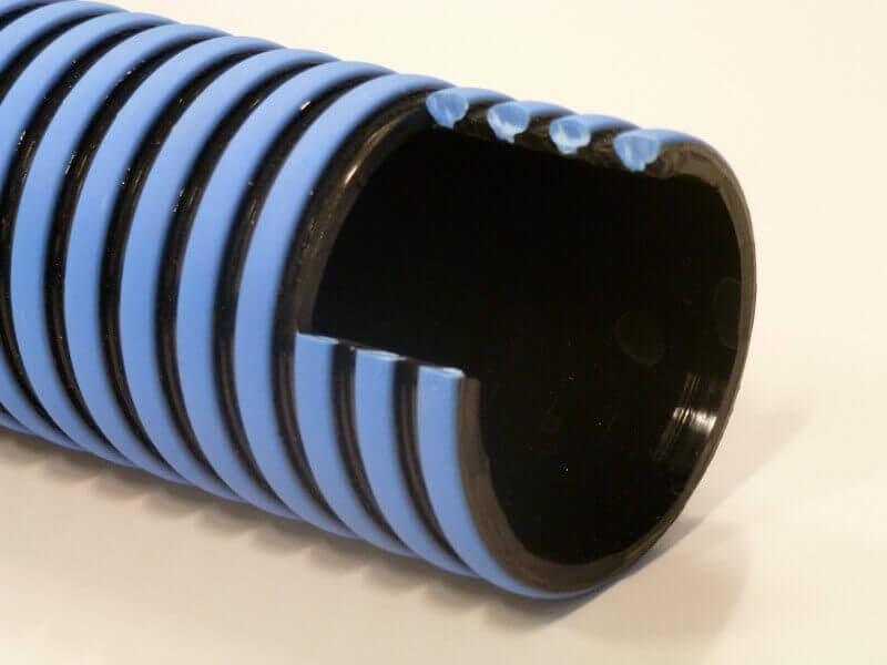 PVC/NBR, czarny, z nałożoną na zewnątrz niebieską spiralą z PVC, wewnątrz gładki, na zewnątrz spirala w kształcie grzyba |