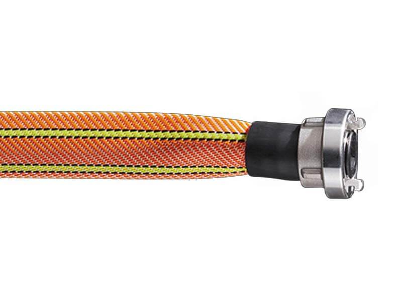 | Materiały: | EPDM, oplot włóknami poliestrowymi, pomarańczowy z żółtymi pasami - widoczny, Złącza Storz z aluminium kutego, z uszczelką NBR. |