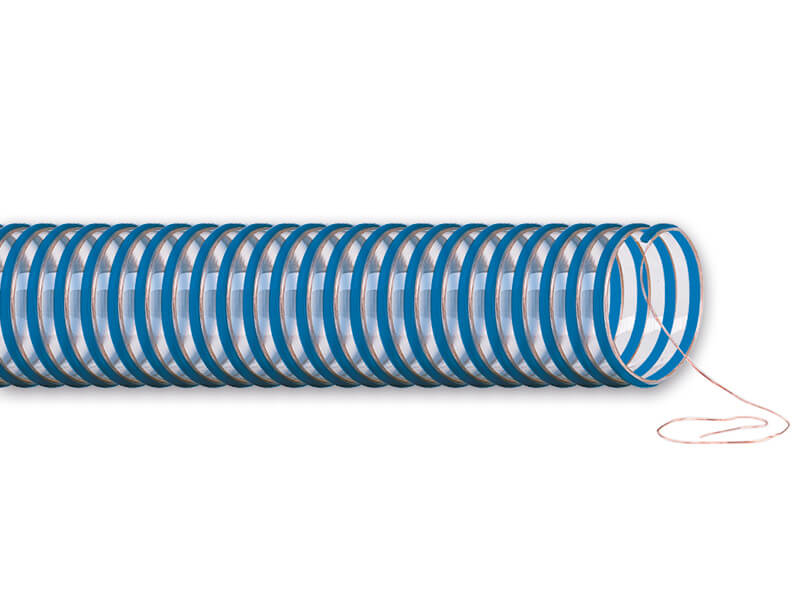 PU, gładki wewnątrz, biały przezroczysty z wbudowaną spiralą z PVC i zewnętrzną linką miedzianą w płaszczu z PU, antystatyczny |