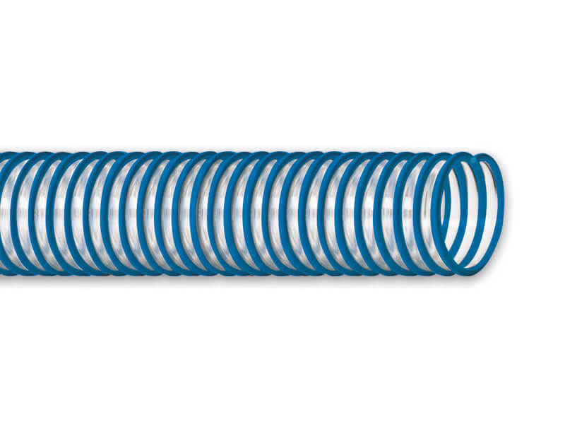PU, gładki wewnątrz, biały przezroczysty z wbudowaną niebieską spiralą z PVC |
