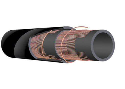 Wąż STRATOS Ω/T D zbudowany jest z kauczuku naturalnego (NR), posiada wzmacniające wkładki tekstylne i miedzianą linkę uziemiającą.