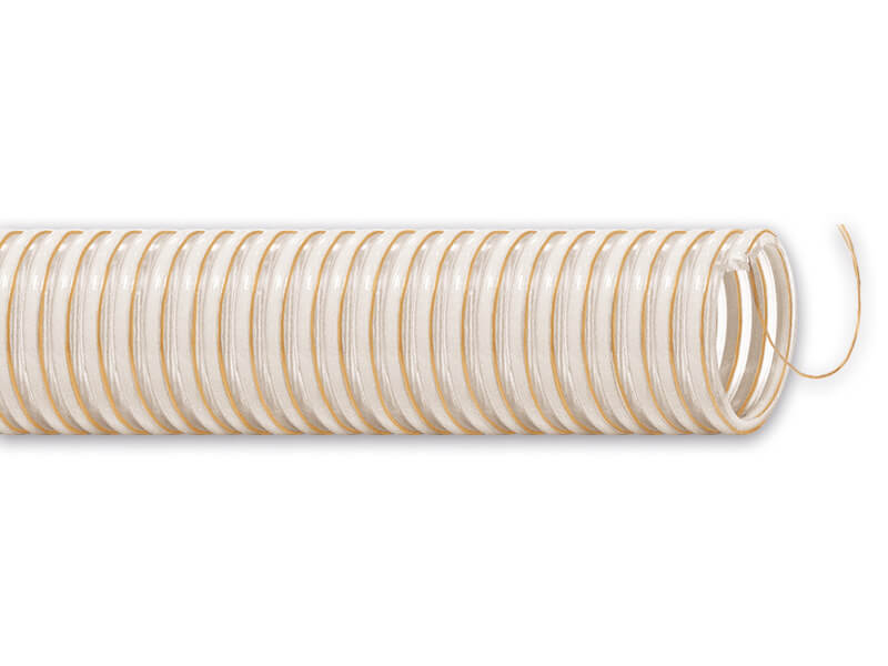 tworzywo sztuczne, gładki, biały przezroczysty z wbudowaną białą spiralą z PVC i zewnętrzną linką miedzianą, wąż antystatyczny