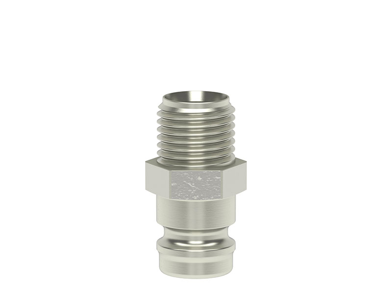 Wtyk szybkozłączki z gwintem zewnętrznym, wykonany z mosiądzu (MS 58) lub mosiądzu niklowanego.