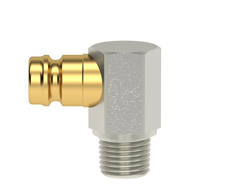 Wtyk szybkozłączki z gwintem zewnętrznym pod kątem prostym, wykonany z mosiądzu (MS 58) niklowanego.