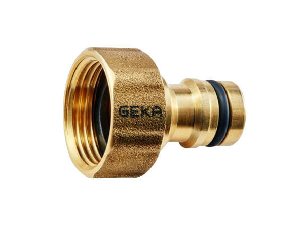 Wtyk szybkozłączki GEKA® Plus "drinking water" z gwintem wewnętrznym. Element ten posiada po jednej stronie wtyk szybkozłączki, zgodne z profilem wtyku popularnych szybkozłączek ogrodowych, a z drugiej strony posiada znormalizowany gwint wewnętrzny z uszczelką. Element najczęściej używany jest jako adapter, urządzeń czy instalacji wyposażonych w gwinty zewnętrzne, takie jak np. krany czy ujęcia wody.