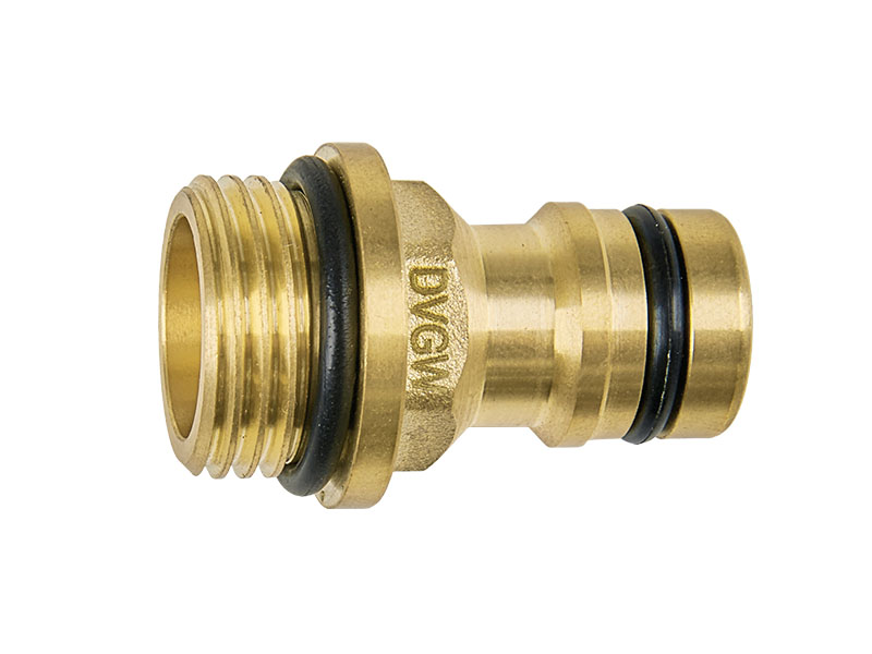Wtyk szybkozłączki GEKA® Plus "drinking water" z gwintem zewnętrznym, pierścieniem i uszczelką. Element ten posiada po jednej stronie wtyk szybkozłączki, zgodne z profilem wtyku popularnych szybkozłączek ogrodowych, a z drugiej strony posiada znormalizowany gwint zewnętrzny, który posiada u nasady pierścień i uszczelkę typu o-ring. Element najczęściej używany jest jako adapter, urządzeń czy instalacji wyposażonych w gwinty wewnętrzne, takie jak np.pistolety do mycia, końcówki zraszające stosowane w przemyśle spożywczym.