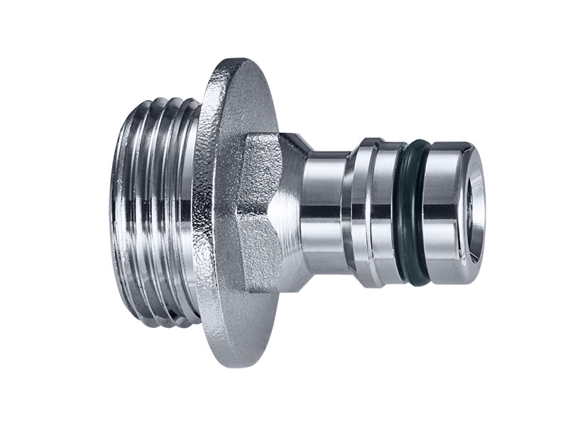 Wtyk szybkozłączki GEKA® Plus "push-fit" z gwintem zewnętrznym. Element ten posiada po jednej stronie wtyk szybkozłączki, zgodne z profilem wtyku popularnych szybkozłączek ogrodowych kompatybilnych z produktami np "GARDENA", a z drugiej strony posiada znormalizowany gwint zewnętrzny. Wtyk posiada talerzyk i uszczelkę, oraz sześciokątną nakrętkę w rozmiarze SW 18 ułatwiającą montaż za pomocą klucza. Element najczęściej używany jest jako adapter, urządzeń czy instalacji wyposażonych w gwinty wewnętrzne, takie jak np. pistolety, końcówki i lance nawadniające czy zraszacze.