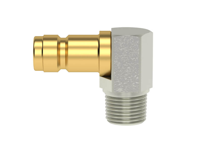 Wtyk szybkozłączki z gwintem zewnętrznym pod kątem prostym, wykonany z mosiądzu (MS 58) lub mosiądzu niklowanego.