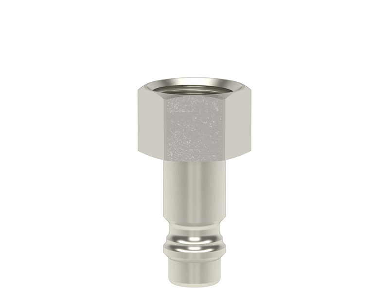 Wtyk szybkozłączki z gwintem wewnętrznym, wykonany z mosiądzu (MS 58) niklowanego, z elementami ze stali szlachetnej i uszczelnieniem z gumy nitrylowej (NBR).