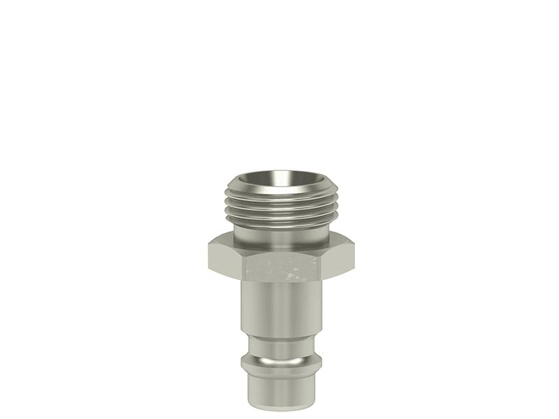 Wtyk szybkozłączki z gwintem zewnętrznym, wykonane z mosiądzu (MS 58) niklowanego, z elementami ze stali szlachetnej i uszczelnieniem z gumy nitrylowej (NBR).