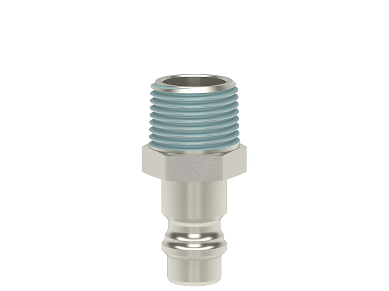 Wtyk szybkozłączki z powlekanym gwintem zewnętrznym, wykonany z mosiądzu (MS 58) niklowanego, z elementami ze stali szlachetnej i uszczelnieniem z gumy nitrylowej (NBR).