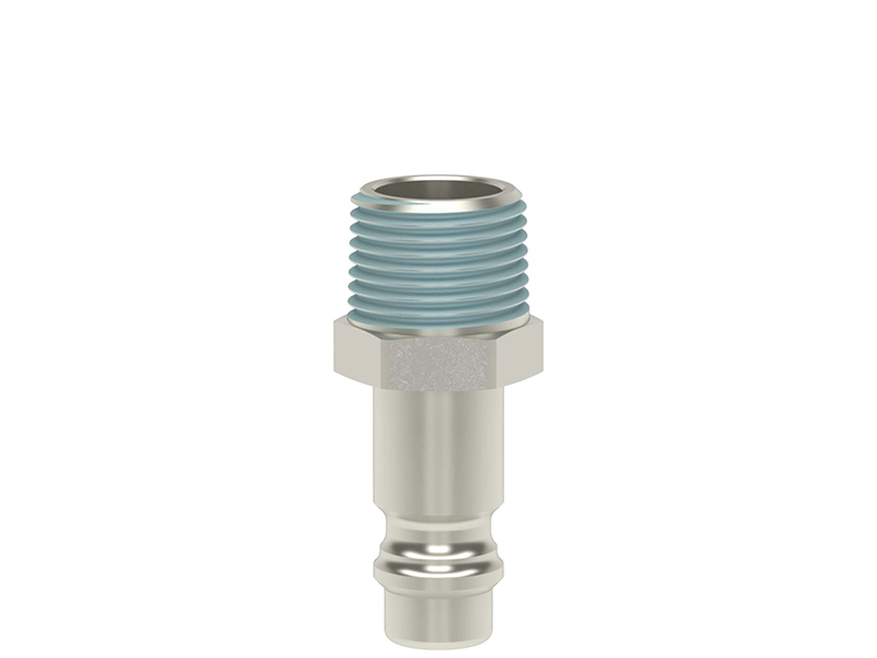 Wtyk szybkozłączki z powlekanym gwintem zewnętrznym, wykonany z mosiądzu (MS 58) niklowanego, z elementami ze stali szlachetnej i uszczelnieniem z gumy nitrylowej (NBR).