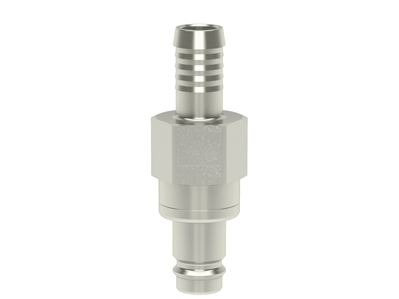 Wtyk szybkozłączki obustronnie odcinającej z króćcem do węża, wykonane z mosiądzu (MS 58) niklowanego, z elementami ze stali szlachetnej, stali hartowanej i uszczelnieniem z gumy nitrylowej (NBR).