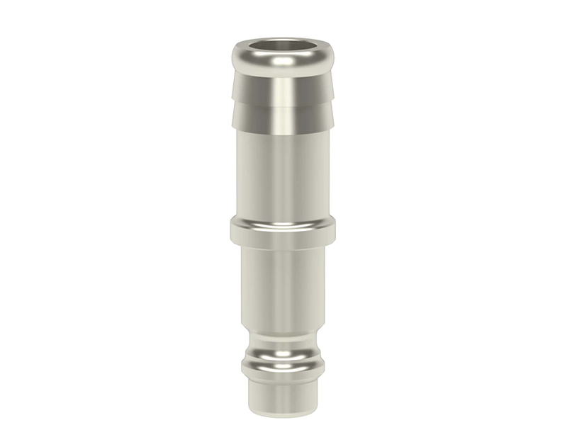 Wtyk szybkozłączki z króćcem do węża, wykonany z mosiądzu (MS 58) niklowanego, z elementami ze stali szlachetnej i uszczelnieniem z gumy nitrylowej (NBR).
