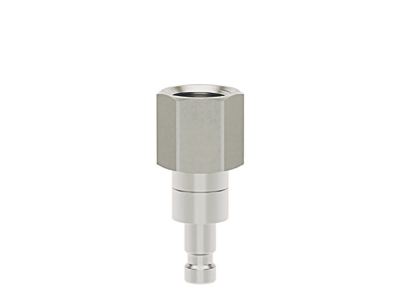 Wtyk szybkozłącza obustronnie odcinającego z gwintem wewnętrznym, wykonany z mosiądzu (MS 58) niklowanego, z elementami ze stali szlachetnej i uszczelnieniem z gumy nitrylowej (NBR).