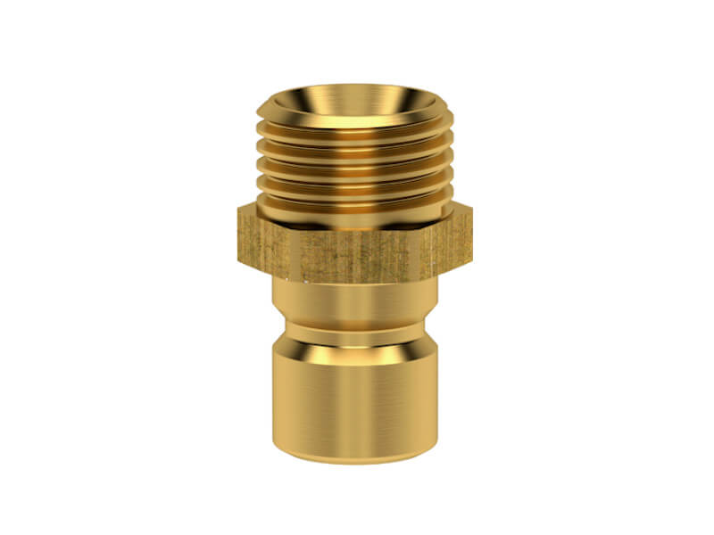 Wtyk szybkozłączki z króćcem do węża, wykonany z mosiądzu (MS 58) lub mosiądzu niklowanego.