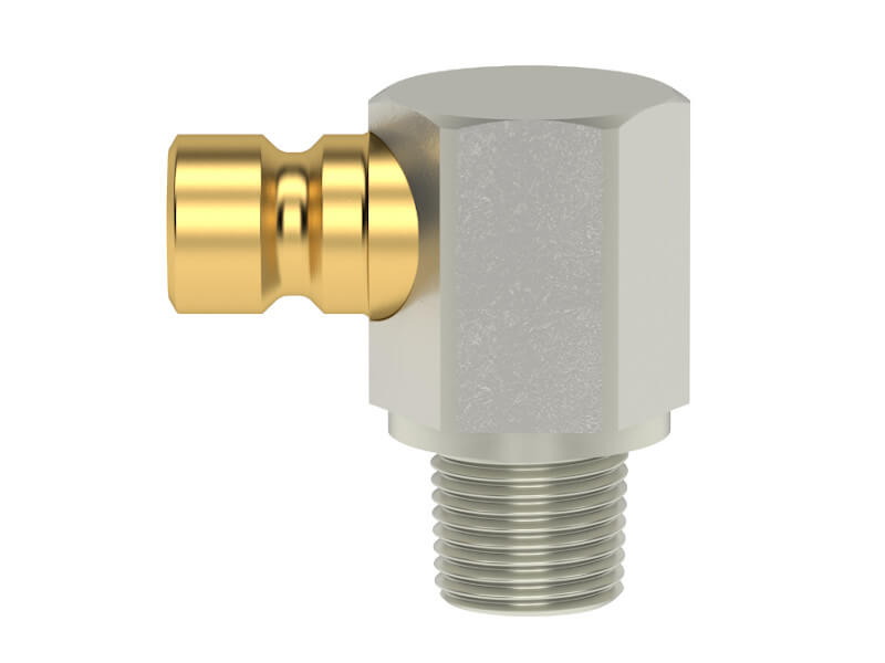 Wtyk szybkozłączki z gwintem zewnętrznym pod kątem prostym, wykonany z mosiądzu (MS 58) niklowanego.