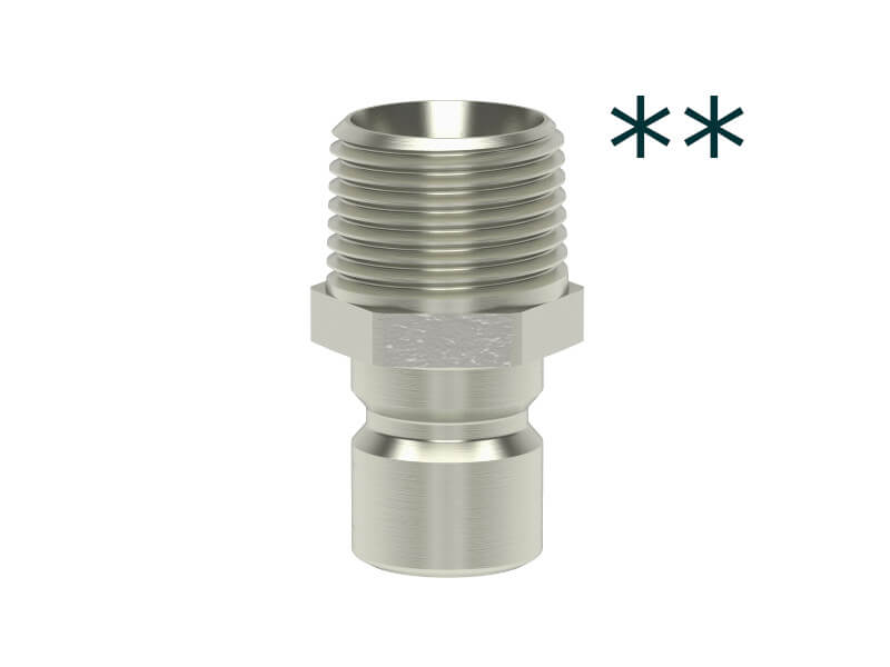 Wtyk szybkozłączki z gwintem zewnętrznym, wykonany z mosiądzu (MS 58) lub mosiądzu niklowanego.