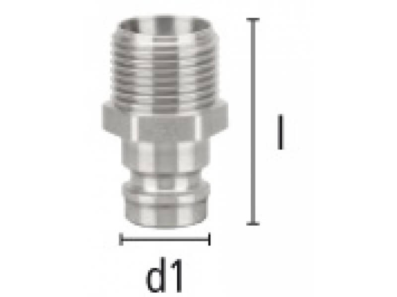 Wtyk szybkozłączki z gwintem zewnętrznym, wykonany ze stali szlachetnej z uszczelnieniem z Vitonu.