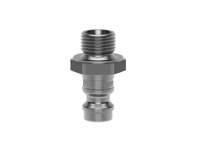 Wtyk szybkozłącza z gwintem zewnętrznym, wykonany ze stali szlachetnej (nierdzewnej).