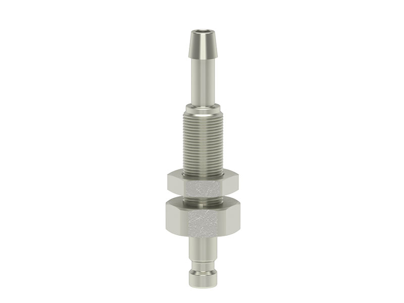 Wtyk szybkozłączki grodziowej z króćcem do węża, nakrętką kontrującą, wykonany z mosiądzu (MS 58) niklowanego.