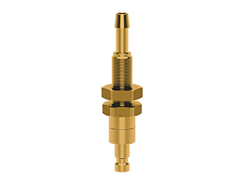 Wtyk szybkozłączki grodziowej obustronnie odcinającej z króćcem do węża i nakrętką kontrującą, wykonany z mosiądzu (MS 58), z elementami ze stali szlachetnej i uszczelnieniem z gumy nitrylowej (NBR).