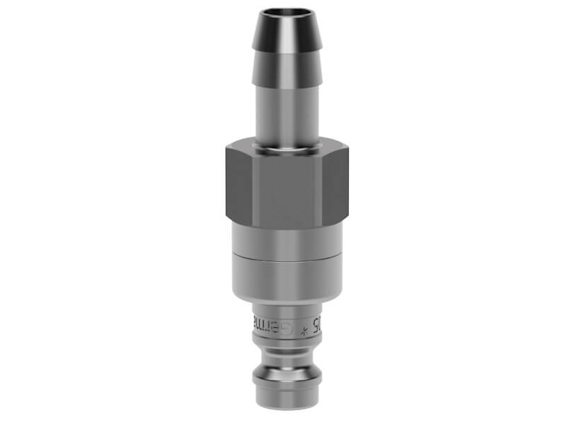 Wtyk szybkozłącza obustronnie odcinającego z króćcem, wykonany ze stali szlachetnej (nierdzewnej) i uszczelnieniem z Vitomu (FKM).