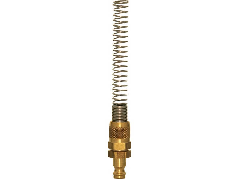 Wtyk szybkozłącza z króćcem i nakrętką zaciskową, sprężyną ochronną na wąż, wykonany z mosiądzu (MS 58), z elementami ze stali ocynkowanej.