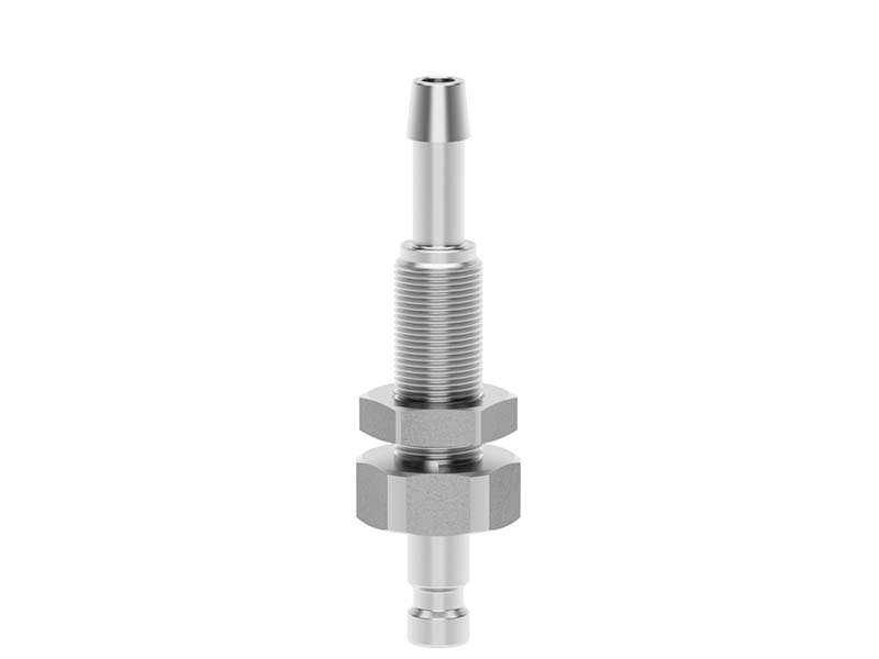 Wtyk szybkozłącza z króćcem do węża, nakrętką kontrującą pod montaż grodziowy, wykonany ze stali szlachetnej (nierdzewnej).