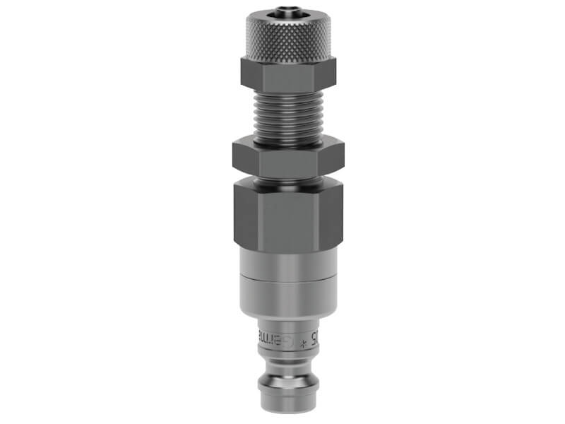 Wtyk szybkozłącza obustronnie odcinającego z króćcem do węża, nakrętką zaciskową na wąż i nakrętką kontrującą pod montaż grodziowy, wykonany ze stali szlachetnej (nierdzewnej) i uszczelnieniem z Vitomu (FKM).