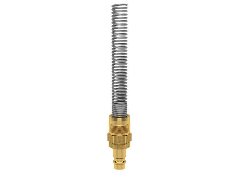 Wtyk szybkozłączki z króćcem do węża, nakrętką zaciskową i spiralą ochronną na wąż, wykonany z mosiądzu (MS 58), z elementami ze stali ocynkowanej.