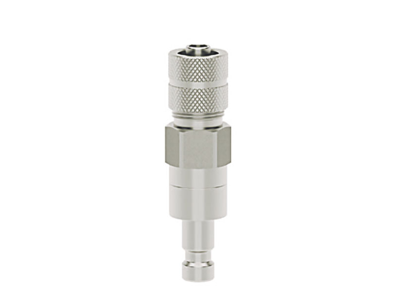 Wtyk szybkozłącza jednostronnie odcinającego z króćcem i nakrętką zaciskową, wykonany z mosiądzu (MS 58) niklowanego, z elementami ze stali szlachetnej i uszczelnieniem z gumy nitrylowej (NBR).