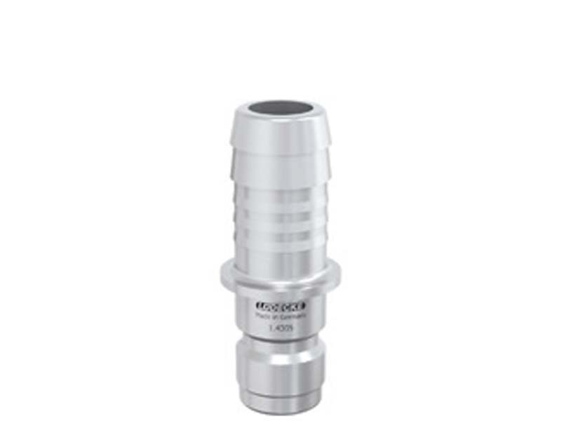 Wtyk szybkozłączki z króćcem do węża, wykonany ze stali szlachetnej.