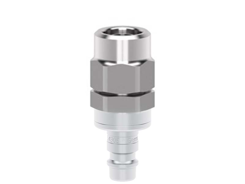 Wtyk szybkozłącza obustronnie odcinającego z króćcem do węża oraz nakrętką zaciskową na wąż, wykonany ze stali szlachetnej (nierdzewnej) i uszczelnieniem z Vitomu (FKM).