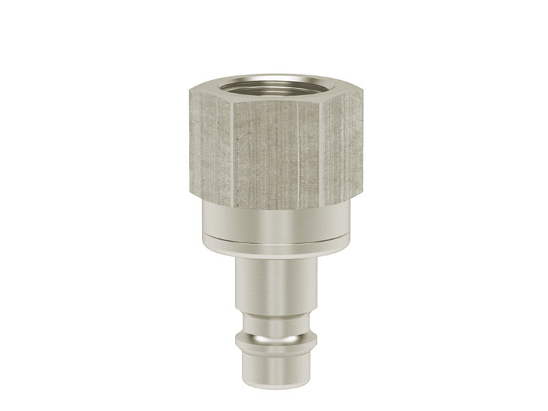 Wtyk szybkozłączki z gwintem wewnętrznym, wykonane z mosiądzu (MS 58) niklowanego, z elementami ze stali szlachetnej i uszczelnieniem z gumy nitrylowej (NBR).