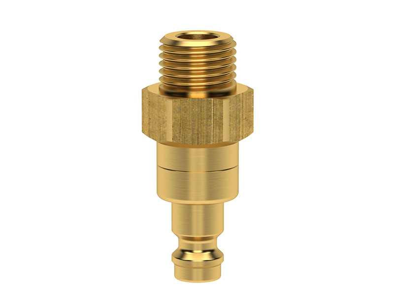 Wtyk szybkozłącza z gwintem zewnętrznym, wykonany z mosiądzu (MS 58), z elementami ze stali szlachetnej i uszczelnieniem z gumy nitrylowej (NBR).