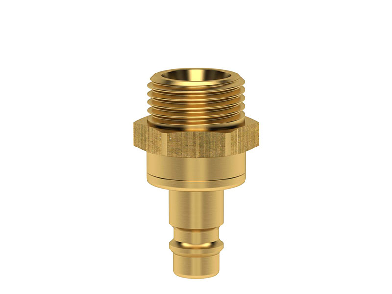 Wtyk szybkozłączki z gwintem zewnętrznym, wykonane z mosiądzu (MS 58), z elementami ze stali szlachetnej i uszczelnieniem z gumy nitrylowej (NBR).