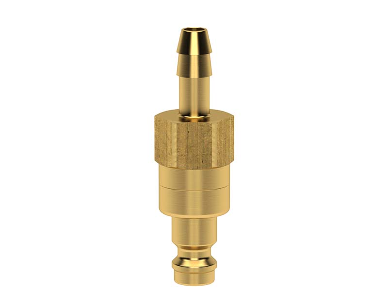 Wtyk szybkozłącza z króćcem do węża, wykonany z mosiądzu (MS 58), z elementami ze stali szlachetnej i uszczelnieniem z gumy nitrylowej (NBR).