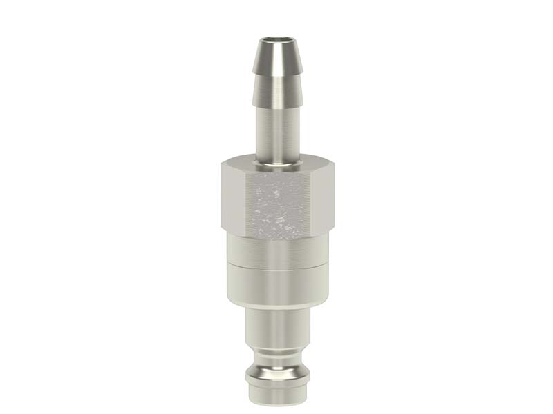 Wtyk szybkozłącza z króćcem do węża, wykonany z mosiądzu (MS 58) niklowanego, z elementami ze stali szlachetnej i uszczelnieniem z gumy nitrylowej (NBR).
