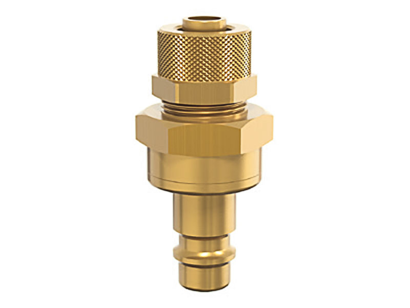 Wtyk szybkozłączki z króćcem do węża i nakrętką zaciskową, wykonany z mosiądzu (MS 58), z elementami ze stali szlachetnej i uszczelnieniem z gumy nitrylowej (NBR).