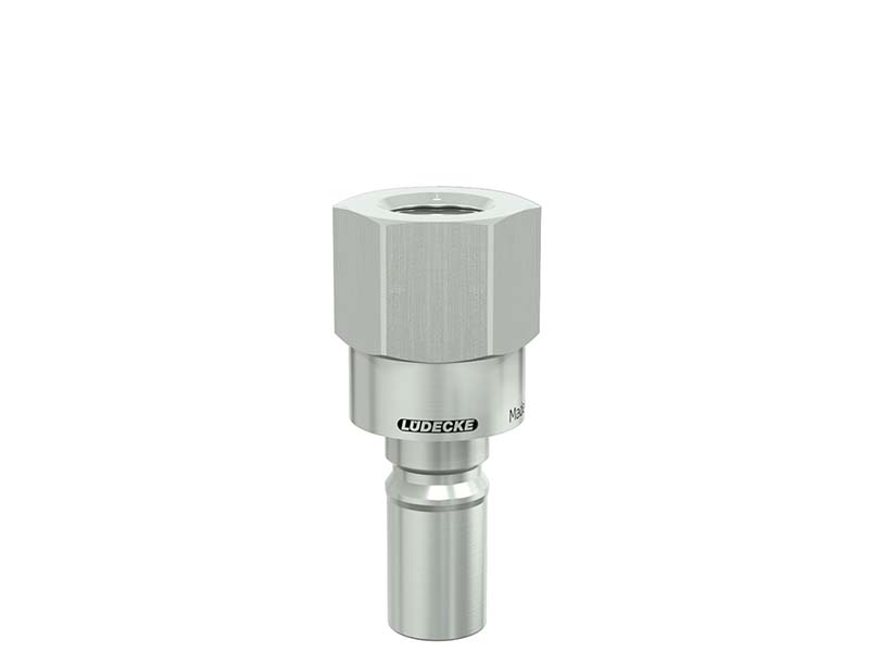 Wtyk szybkozłączki z gwintem wewnętrznym, wykonane z mosiądzu (MS 58) niklowanego, z elementami ze stali szlachetnej i uszczelnieniem z gumy fluorowej (FKM).