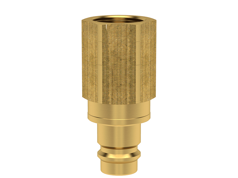 Wtyk szybkozłączki obustronnie odcinającej z gwintem wewnętrznym, wykonane z mosiądzu (MS 58), z elementami ze stali szlachetnej i uszczelnieniem z gumy nitrylowej (NBR).