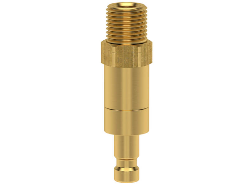 Wtyk szybkozłączki z gwintem zewnętrznym i zaworem odcinającym, wykonane z mosiądzu (MS 58).