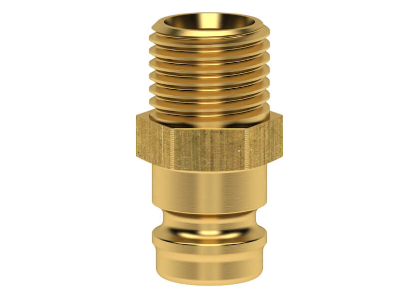 Wtyk szybkozłączki z gwintem zewnętrznym, wykonany z mosiądzu (MS 58) lub mosiądzu niklowanego.