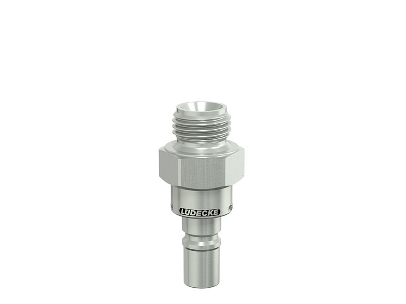Wtyk szybkozłączki z gwintem zewnętrznym, wykonane z mosiądzu (MS 58) niklowanego, z elementami ze stali szlachetnej i uszczelnieniem z gumy fluorowej (FKM).